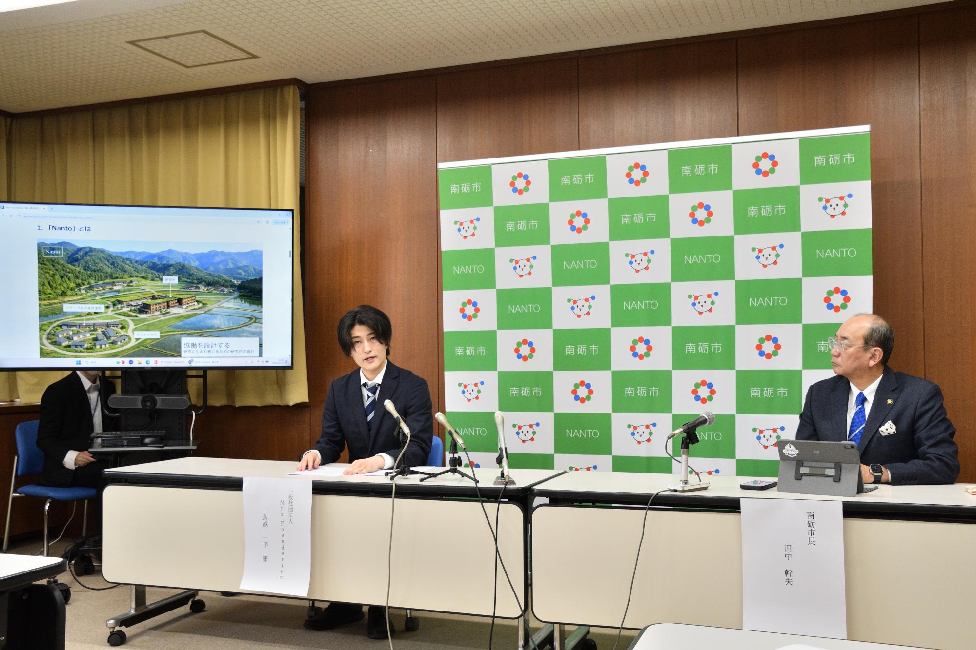 南砺市と一般社団法人「Nyx Foundation」が共同記者会見を行い、市内に新たな研究拠点「Nanto」を建設する構想を発表しました。
