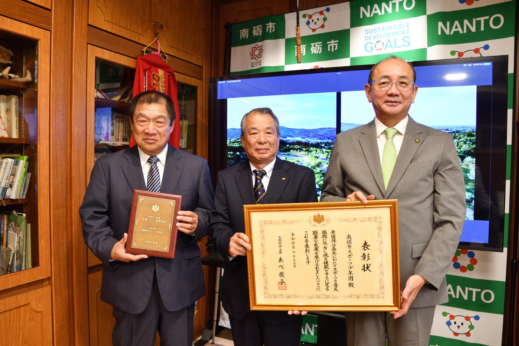 令和7年度の生涯スポーツ優良団体として文部科学大臣表彰を受賞された南砺市スポーツ少年団の永山惠本部長と近川利行副本部長が南砺市役所を訪れ、田中市長に喜びを報告しました。