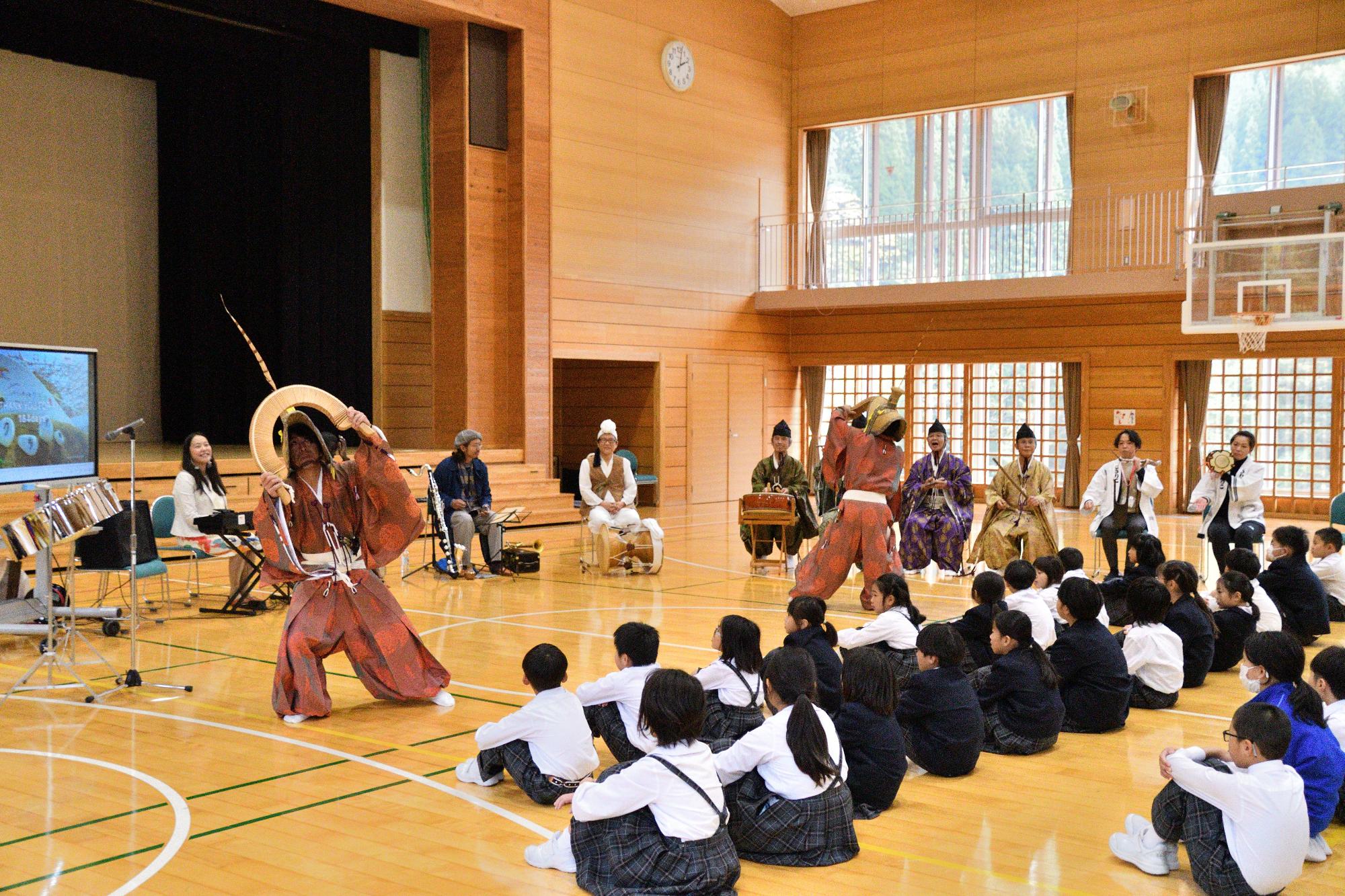 この事業は、地域住民と万博参加国や関係者が音楽やスポーツを通じて国際交流を行う「万博国際交流プログラム」で、上平小学校には、ジャズピアニストでもある中島さんが率いる「クラゲバンド」のメンバーと地元の越中五箇山こきりこ唄保存会が訪れました。