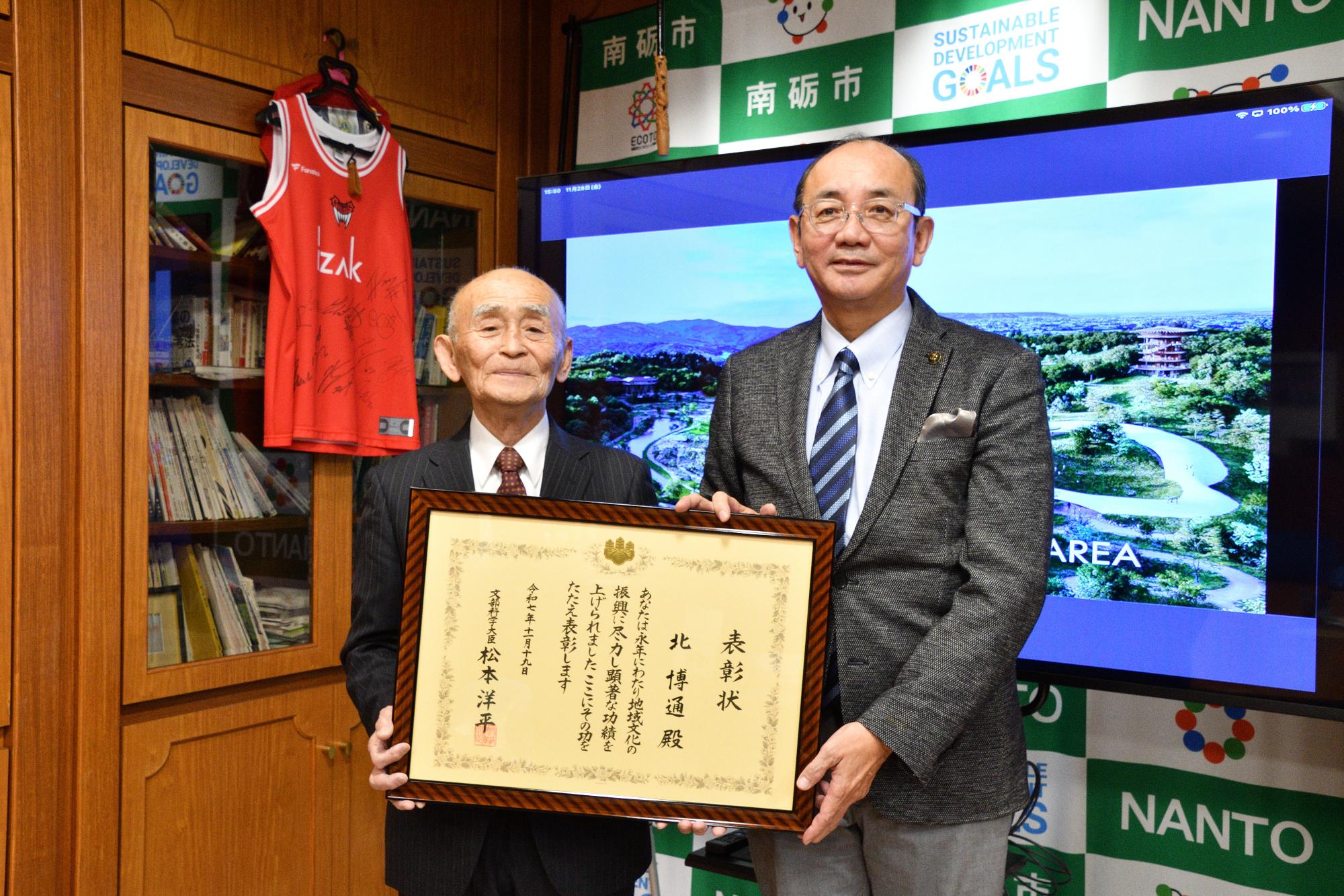 令和7年度の地域文化功労者として文部科学大臣表彰を受賞された北博通さん(菅沼)が南砺市役所を訪れ、田中市長に喜びを報告しました。