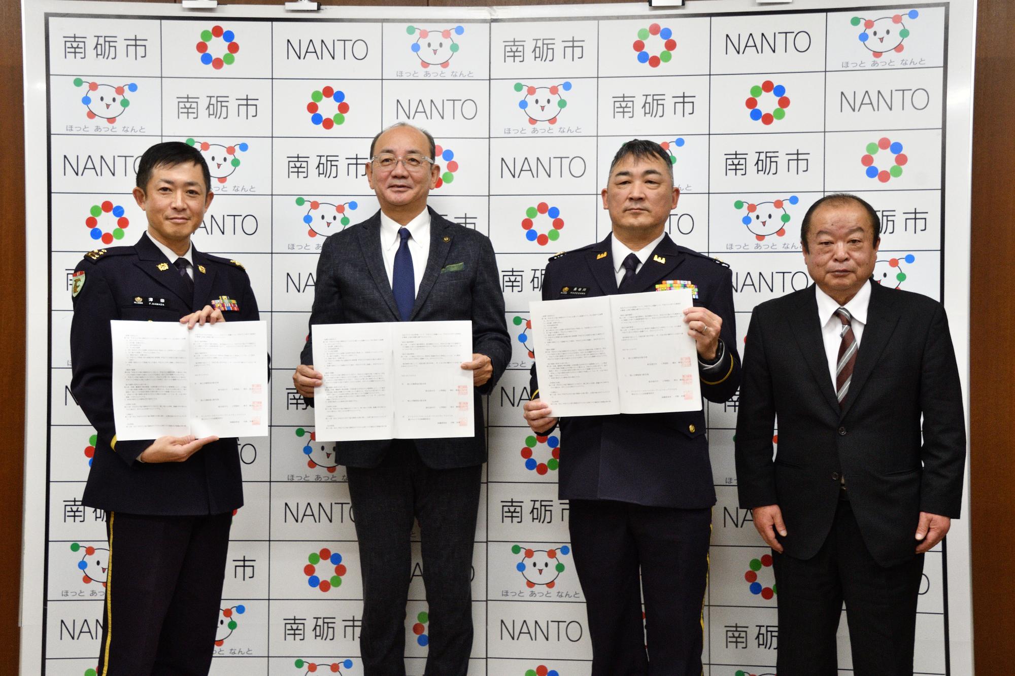 南砺市役所で開かれた調印式には、金沢駐屯地の澤田典宏1等陸佐、富山駐屯地の長谷川敬彦3等陸佐、大会組織委員会副委員長の田中市長、全日本スキー連盟の長田一政理事が出席しました。