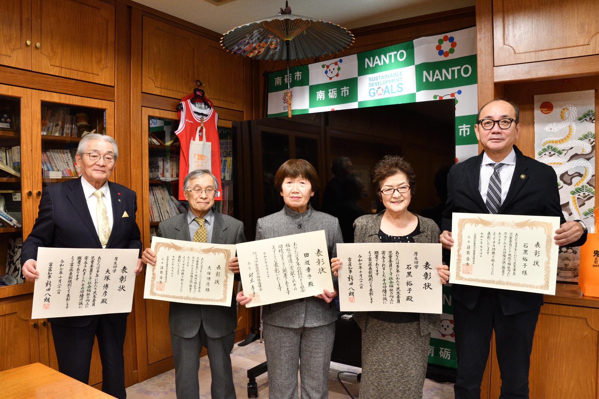 全国および県から福祉功労の表彰を受けた民生委員児童委員3名が南砺市役所を訪れ、田中市長に受賞の喜びを報告しました。