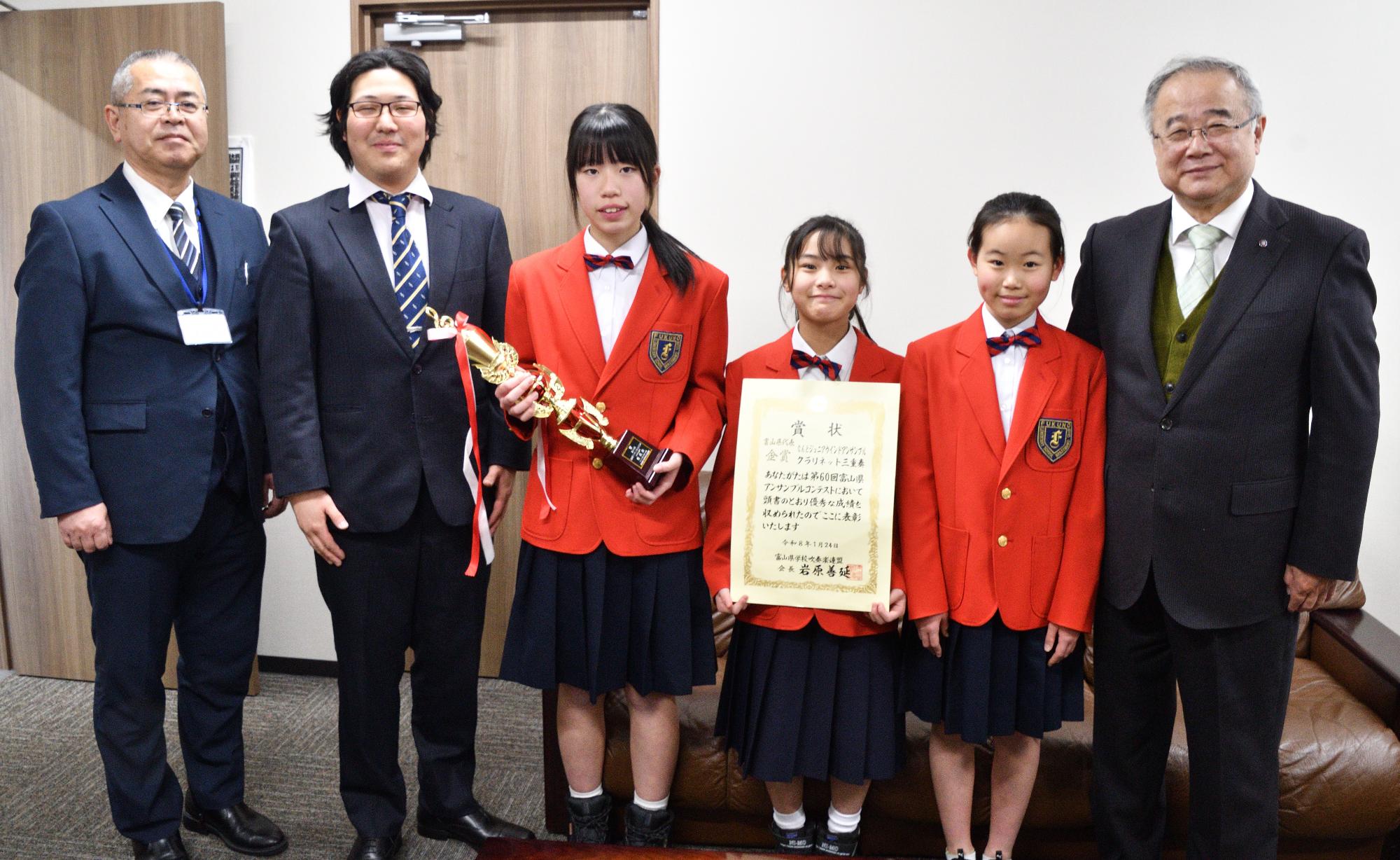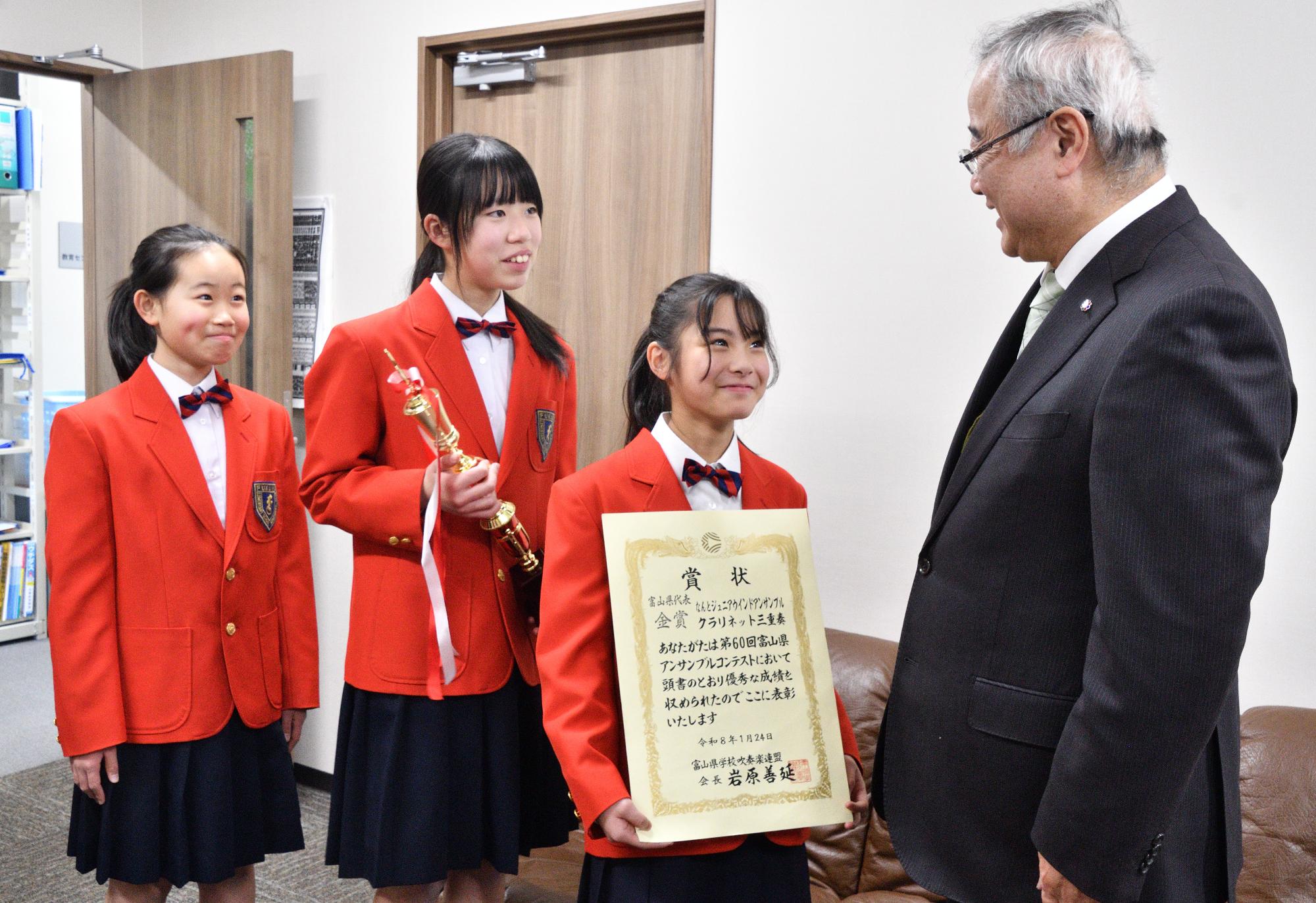そのうち、富山県代表として「第49回北陸アンサンブルコンテスト」への出場を決めたクラリネット三重奏のメンバー3名が南砺市役所を訪れ、松本教育長に喜びと意気込みを語りました。