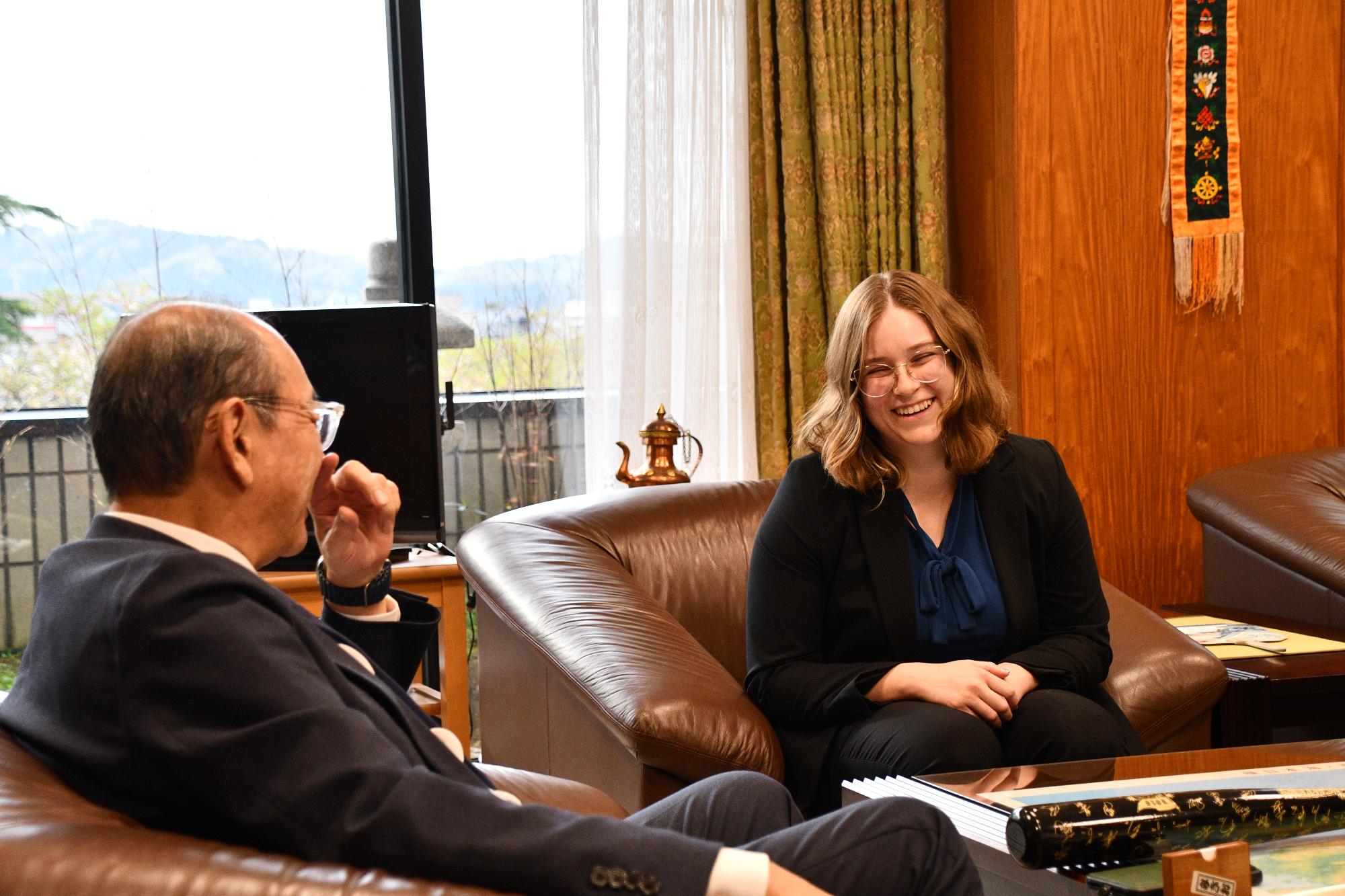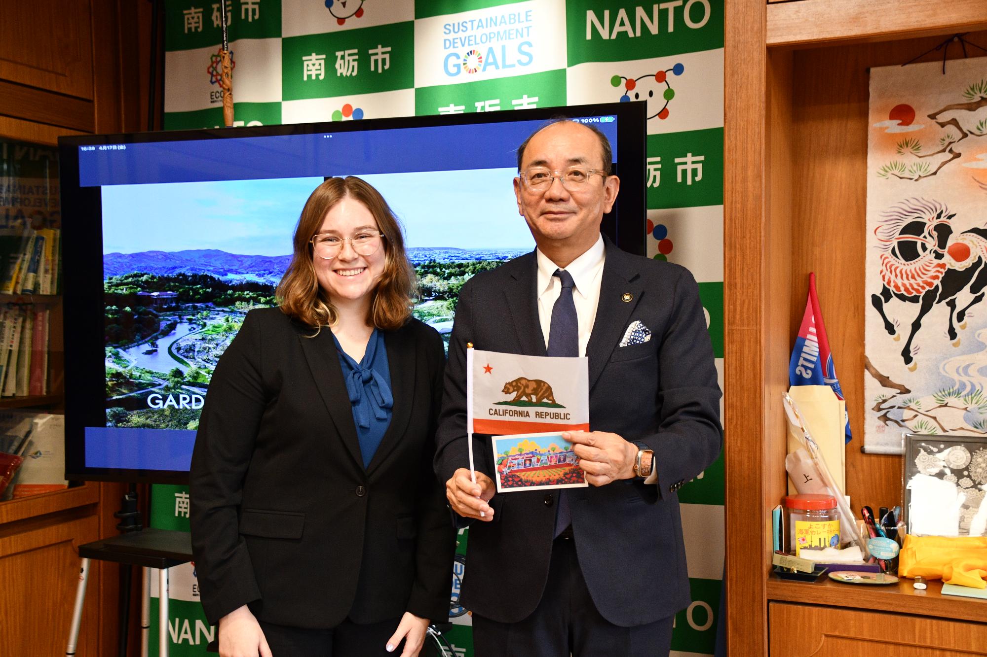着任にあたり、田中市長は「英語が毎日こどもたちの耳に入ってくる環境を作り、英語が自由なものであることが伝えてほしい」と激励しました。その後、南砺市とカリフォルニアの文化の紹介や、これからの日本での暮らしについて懇談しました。
